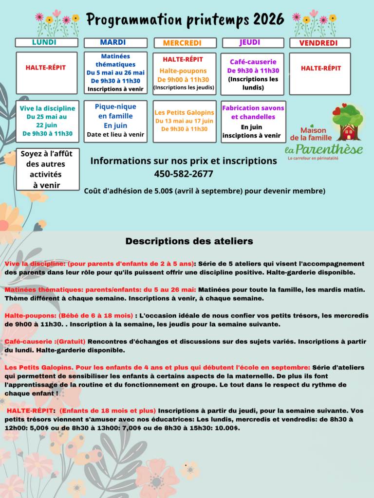 Un lieu d’accueil, d’écoute, d’échanges et de formations diverses pour vous outiller dans votre rôle parental.
